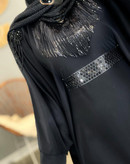🗒️توضیحات :داخلش بند تنظیم سایز داره و برای هرسایزی فیت تن میشه،تنخور فوق العاده شیک، پارچه کاملا مشکی، ریسه های پولکی دوخته شدن بدون ریزش. کمری و مچ آستین پولک دوزی داره , سردوشی جواهردوزی داره