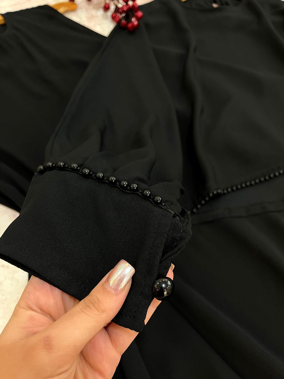 🗒️توضیحات :داخل پیراهن بندتنظیم سایز داره،پارچه کاملا مشکی و لخت، تنخور زیباوشیک، مرواریدهادوخته شده و بدون ریزش، مچ استین دکمه داره برای راحتی وضو، اصلا بدن نمایی پرزدهی یاابرفت نداره